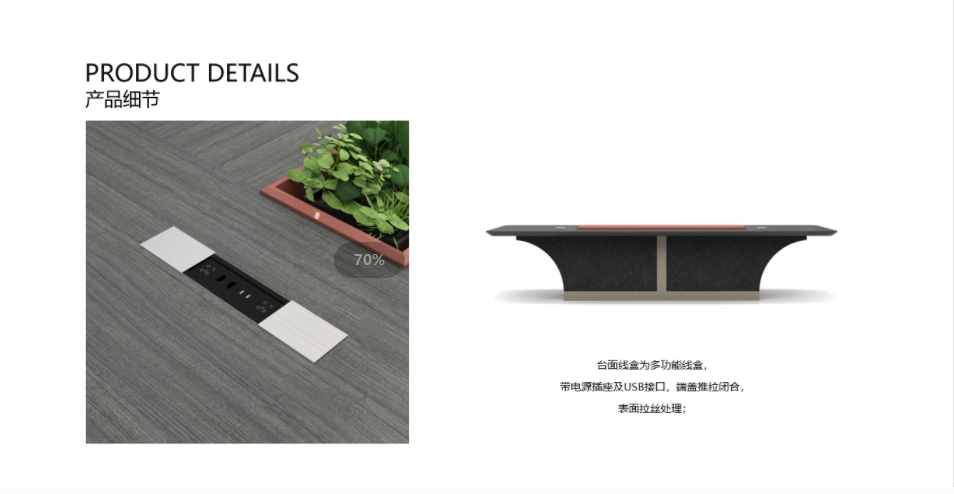 • 台面采用50MM厚E1环保MFC板材60度斜边工艺处理,全A标准PVC封边,斜边油漆工艺处理,支撑柜体采用16mm厚E1环保MFC板材,异形处理,香槟金拉丝纹理板材线条点缀;所有板材采用德国夏特饰面纸;配置金属拉丝多功能线盒。