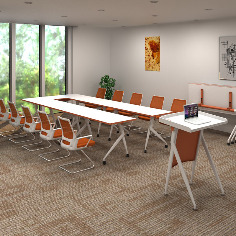 台面:主台面OF-0721暖白绒面,橙色PVC封边,台面 可折叠;